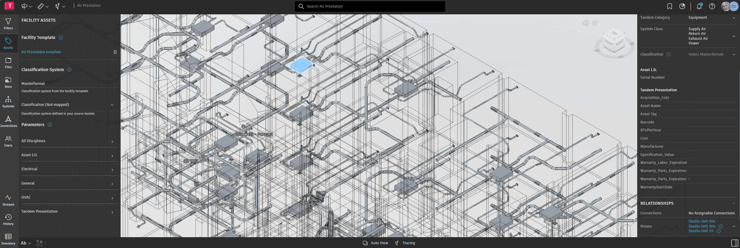 The team pushed this even further by creating a custom connection from the ACC Build Parameter Service that automatically pulls assets from the catalog into Revit—or directly into Tandem. By matching the digital twin’s parameters exactly, subcontractor data integrates seamlessly, and Don can run quality control inside the same data-rich 3D model—catching and correcting issues without extra steps or duplicate work.